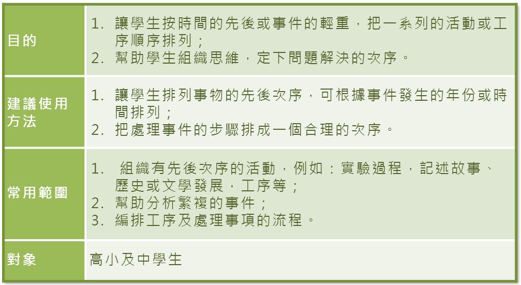 除大腦彩圖外,還有多種不同的圖表可應用於教學上,幫助學生記憶及組織思維(James Bellanca,1990)。以下是其中幾類圖表及有關的簡介: