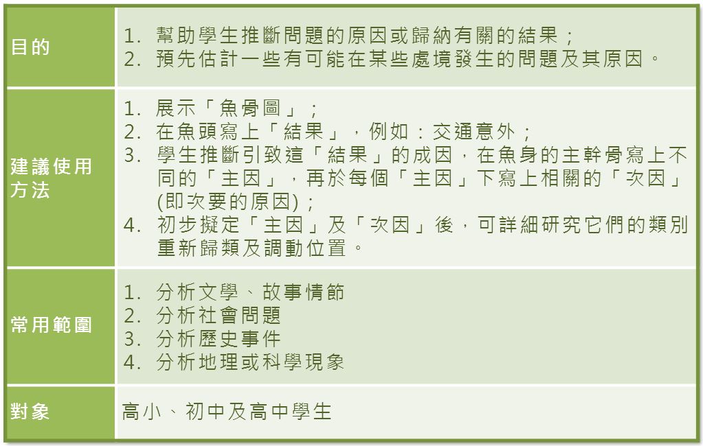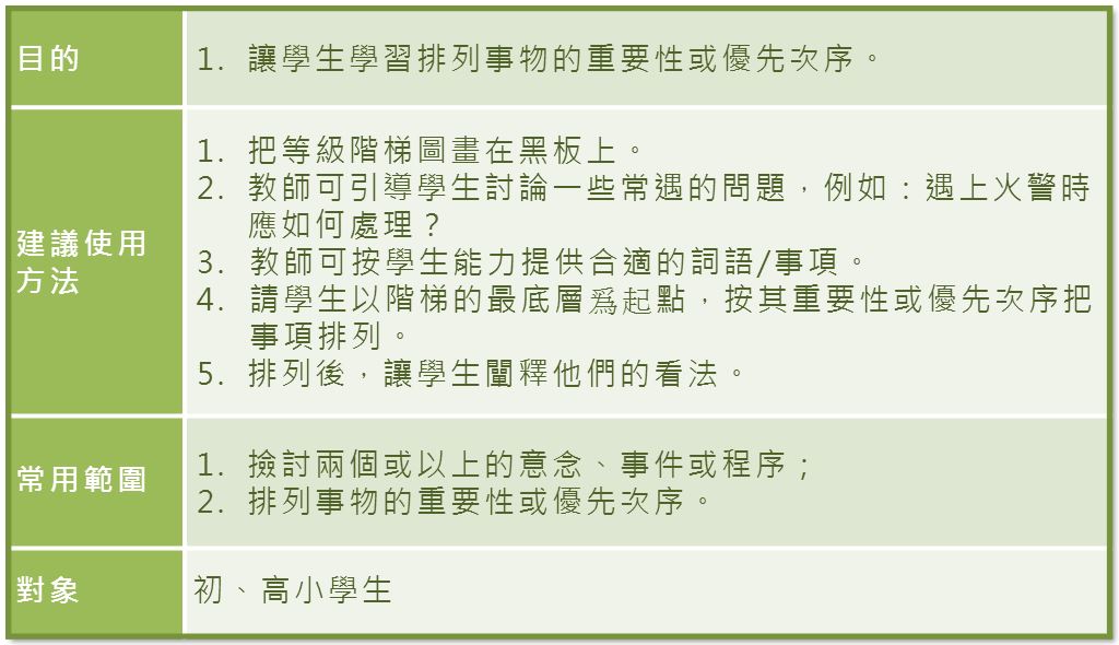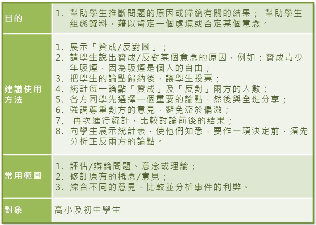 - 無論任何年齡的學生,教師都可在不同的學習層面,例如,透過課堂活動或討論,訓練他們的思想技巧。