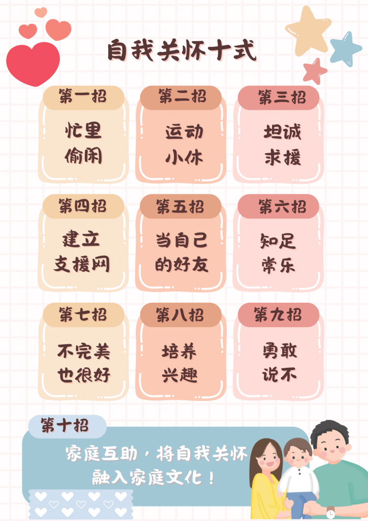爱子女,就从爱自己开始。只有装满自己的杯子,才有源源不断的爱流向家人。在需要时寻求支持,也是爱自己的表现。除了以上的小招式外,有需要时,也可以浏览其他机构所提供的情绪辅导服务和精神健康信息。