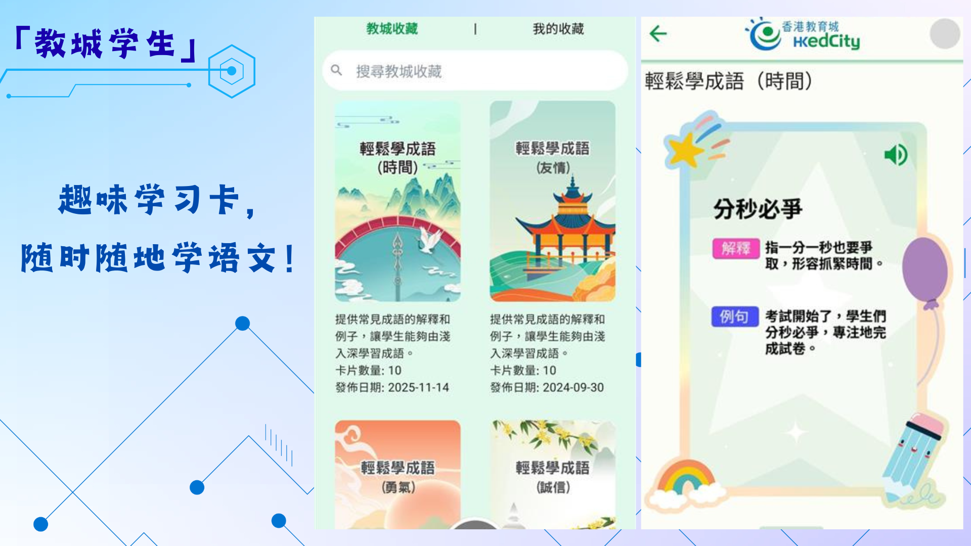 想子女更好地利用碎片时间学习,「教城学生」应用程式帮到你!应用程式内众多实用及内容丰富的学习卡正逐步更新,从中文成语到英文生字,学生都能轻松自学,温故知新。家长也可以一起参与,在应用程式内留下你对子女的鼓励,与子女一起成就出色学习表现!