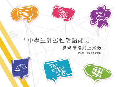 评述性话语是指使用语言来传达资讯,包括逻辑和科学思想,主要功能涉及传输抽象的、事实的、逻辑的或精确的信息。 随著进入高小及初中的学习阶段,课程对学生掌握评述性话语能力的要求有所提高,学生需透过深入阅读不同科目的评述性教材,以掌握各学科的知识,并持续提升阅读能力。 为提升学生的评述性话语能力及学习效能,教育局言语治疗服务组制作了「中学生评述性话语能力」学习策略网上资源。 网上资源的主要对象为初中学生,高小学生也适用。内容涵盖六个评述性话语类型,分别为列举、描述、程序说明、比较、因果解释及解难。网上资源包括资源简介及训练材料,当中包括训练框架、附有日常情境及学科主题示例的训练简报及视觉提示。校本言语治疗师及教师可按学生的能力及需要使用本网上资源,协助学生提升日常沟通及加强不同学科的学习。