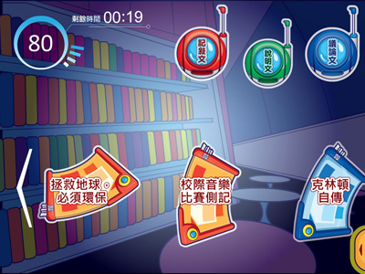 資源套的另一個重點,就是六款「互動遊戲」,讓學生可以從遊戲中,學習各種閱讀策略,例如找出類屬詞、從篇名預測文體等等。