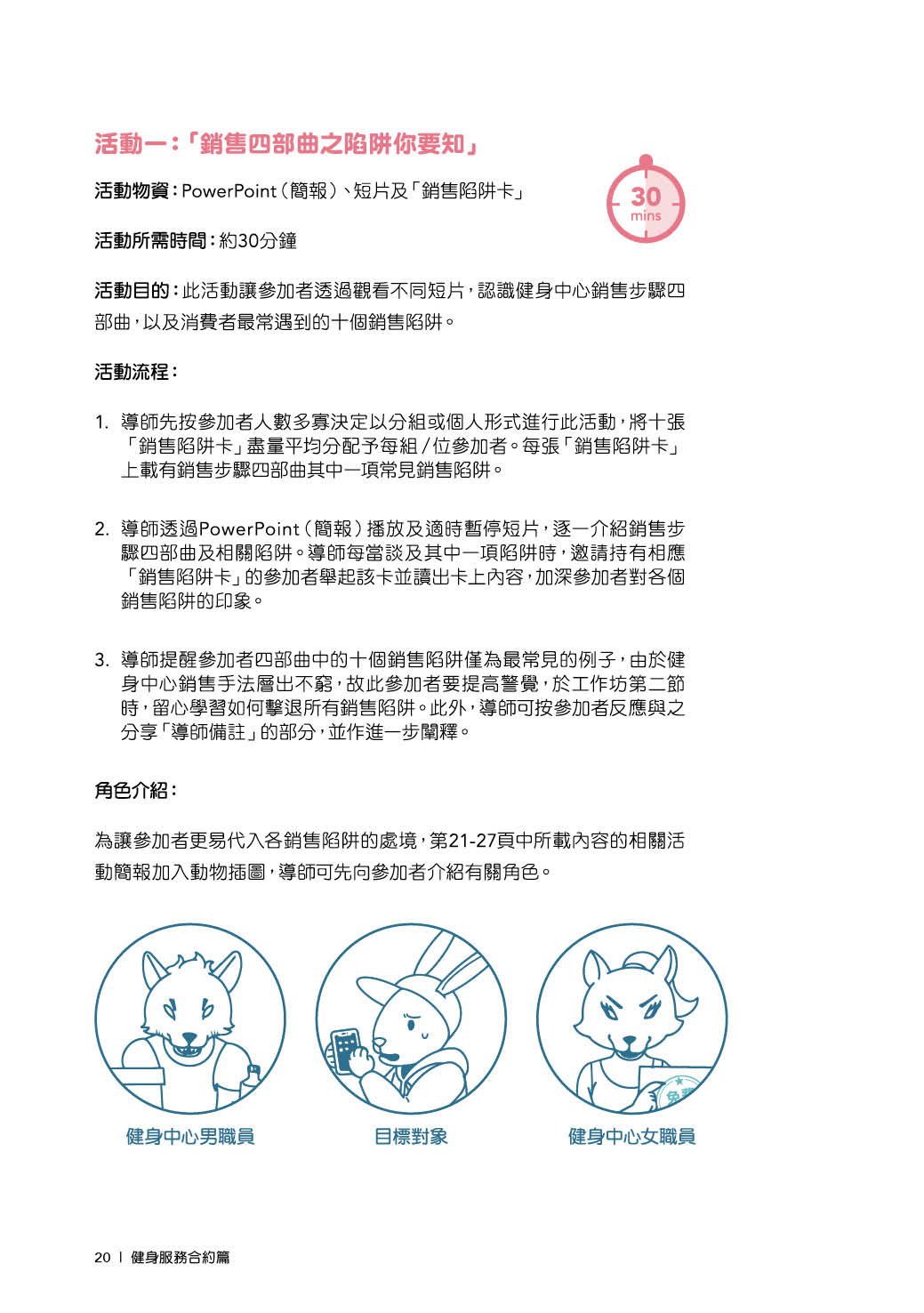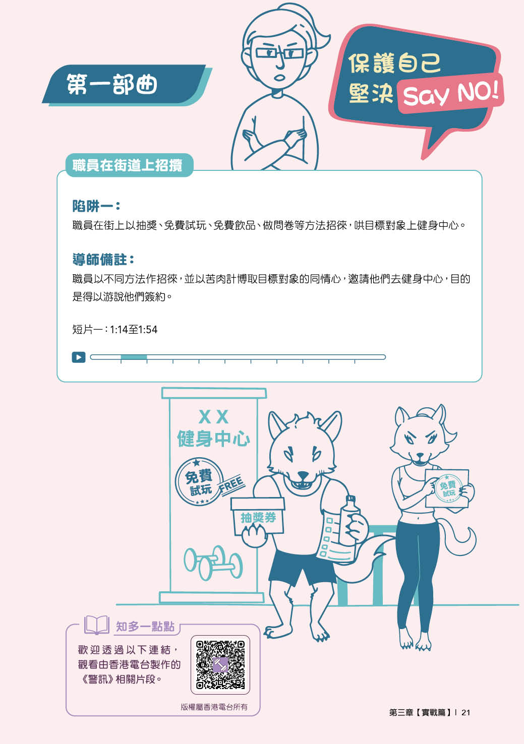 第三章:「實戰篇」向導師提供工作坊的建議教材,包括活動教案、個案重演短片、遊戲卡及海報,教材加入「體驗式」活動環節,包括觀看個案短片、反思活動、角色扮演及線上遊戲,讓目標對象認識部分健身中心的不良營商手法,協助他們擊退有關銷售陷阱,並養成正確消費態度。
