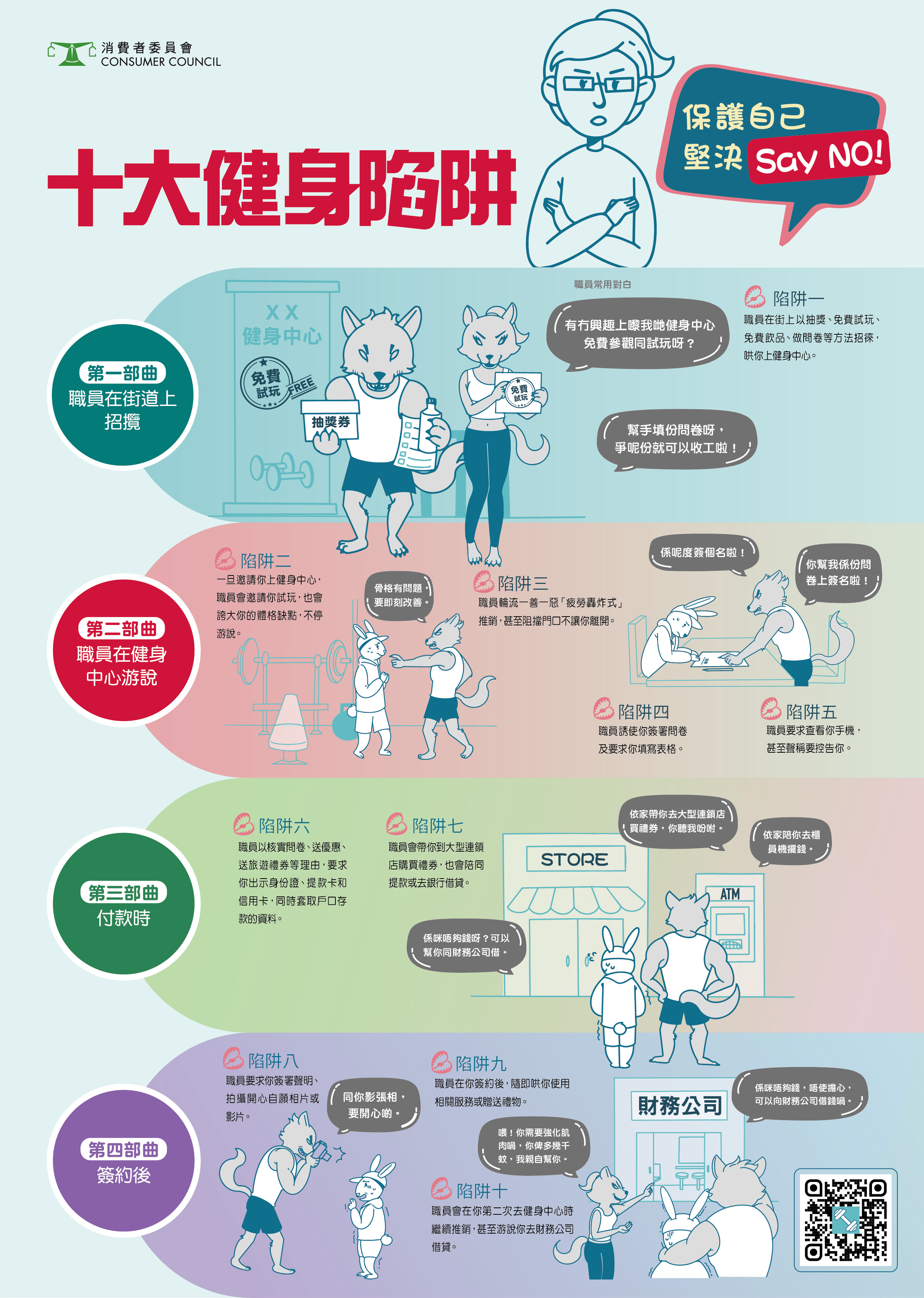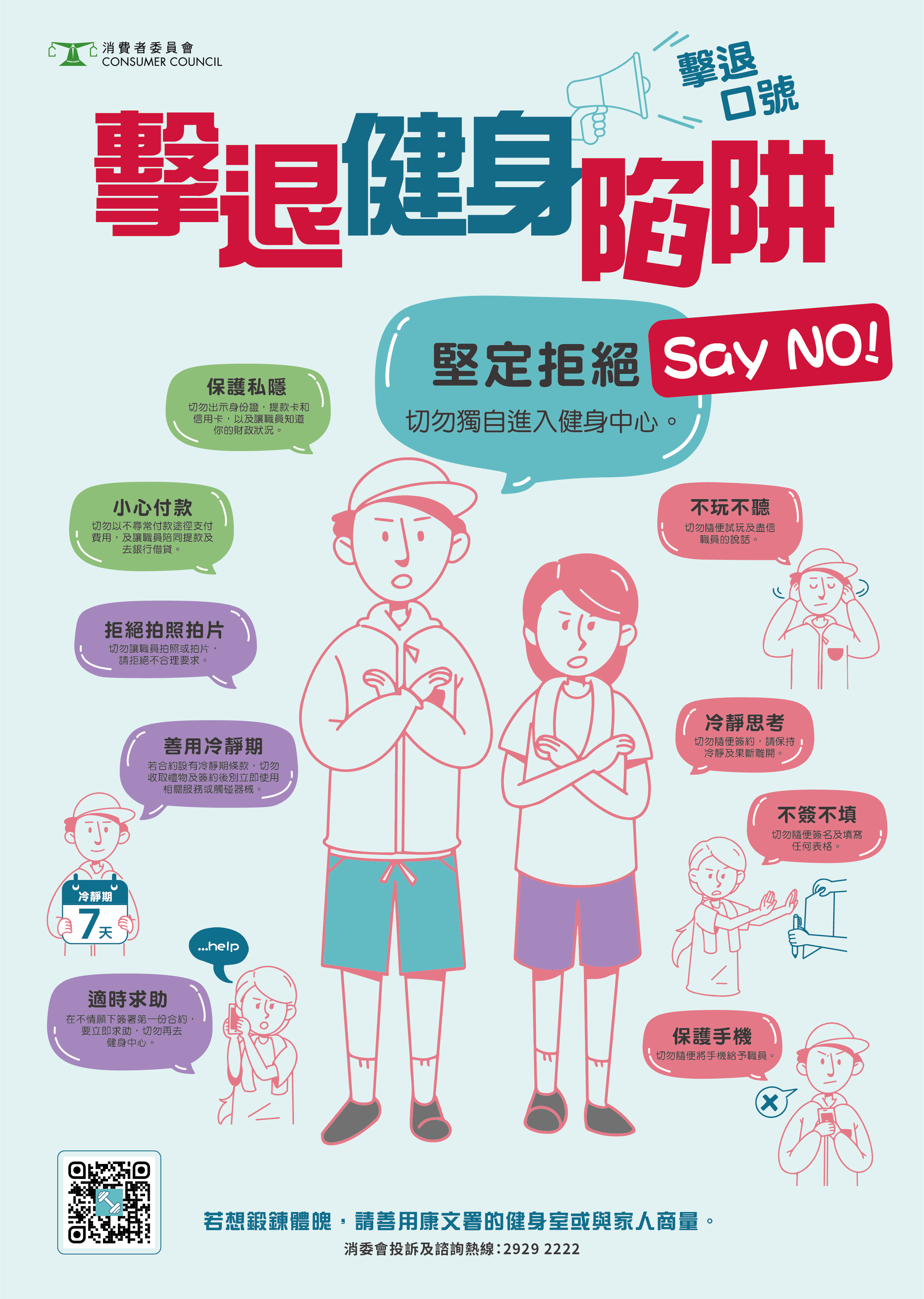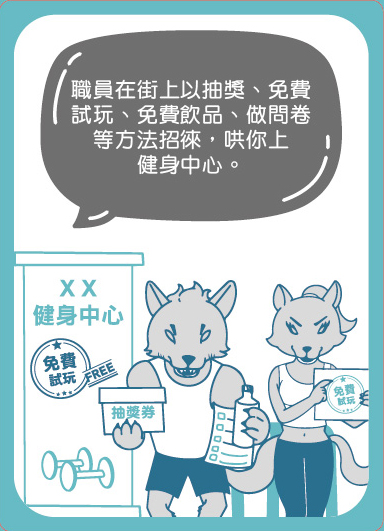 消委會正密鑼緊鼓,透過製作一系列針對健身及美容中心銷售陷阱的資源教材套:包括資源手冊(內附遊戲卡)、個案重演短片及海報,協助前線社會/教育工作者教導目標對象認識健身及美容中心的常見銷售陷阱,以及擊退相關陷阱的自保之道。消委會並鼓勵相關社福機構/教育機構能夠運用此系列資源教材套,踴躍為目標對象舉辦教育工作坊,加強他們的自我保護能力,以能成功擊退商戶的不良營商手法。
