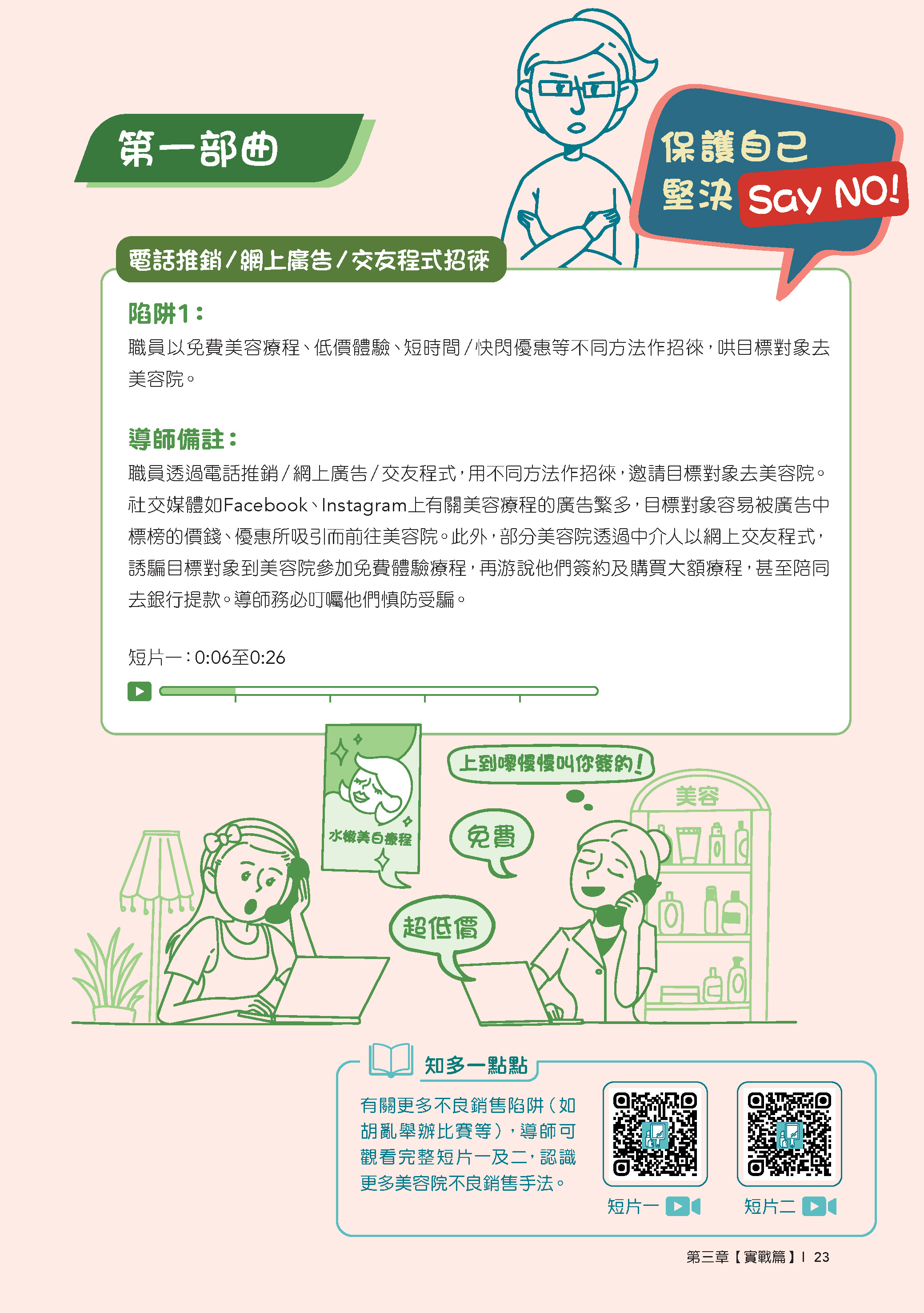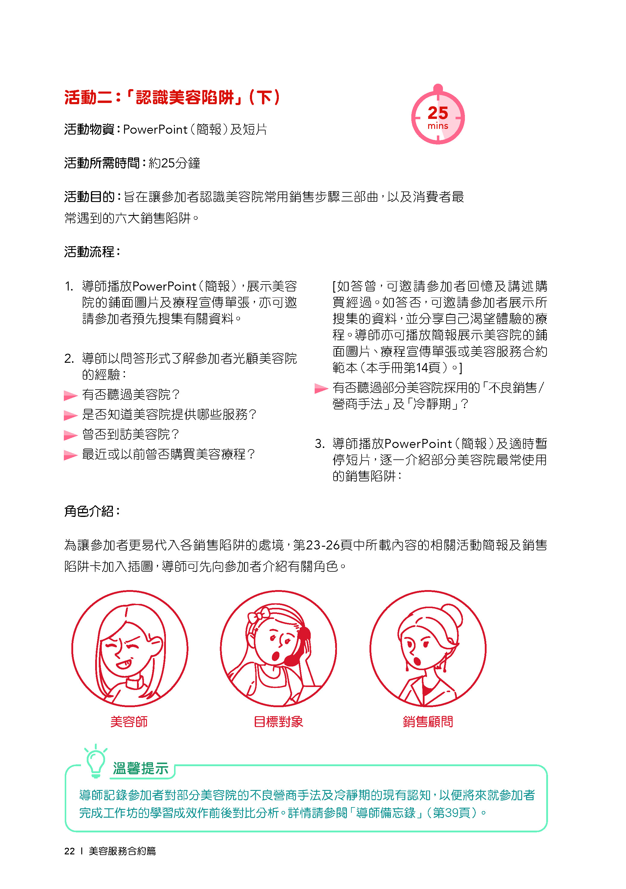 第三章:「實戰篇」提供工作坊的建議活動,當中加入「體驗式」學習元素,包括觀看個案重演短片、進行互動遊戲及角色扮演,讓目標對象循序漸進地認識部分美容院的不良銷售手法,協助他們擊退有關銷售陷阱,並培養正確消費態度。