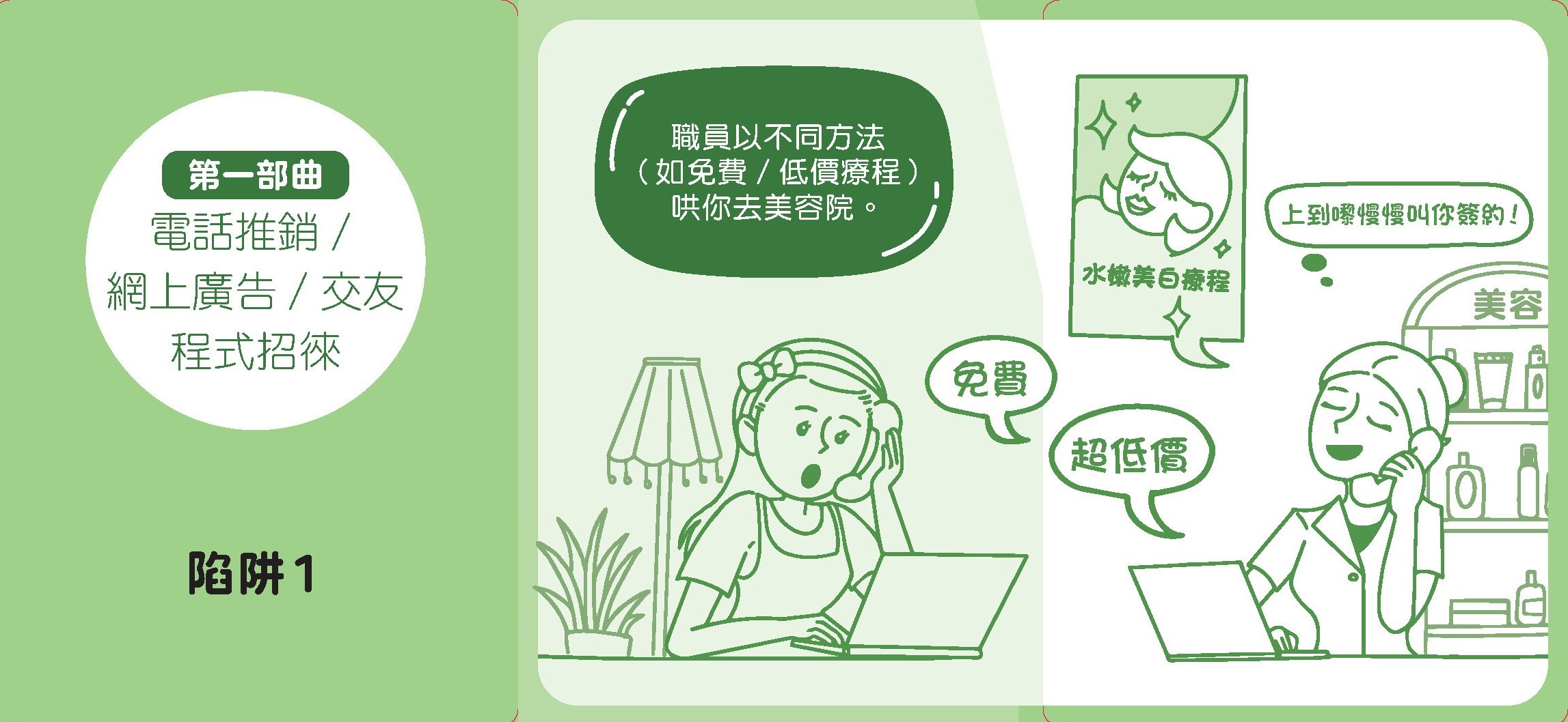 第一章:「知識篇」簡介消費者應有的權利與責任,以及消費者保障法例,藉此闡明部分美容院的不當銷售行為,如何涉嫌觸犯法例和損害消費者的權益。一旦目標對象遇上類似銷售陷阱時,導師亦能迅速為其提供協助或尋求進一步的指引,如協助家長/照顧者向消委會求助。此章同時介紹常見的美容療程(包括醫療美容),讓導師對相關行業服務有初步認識。