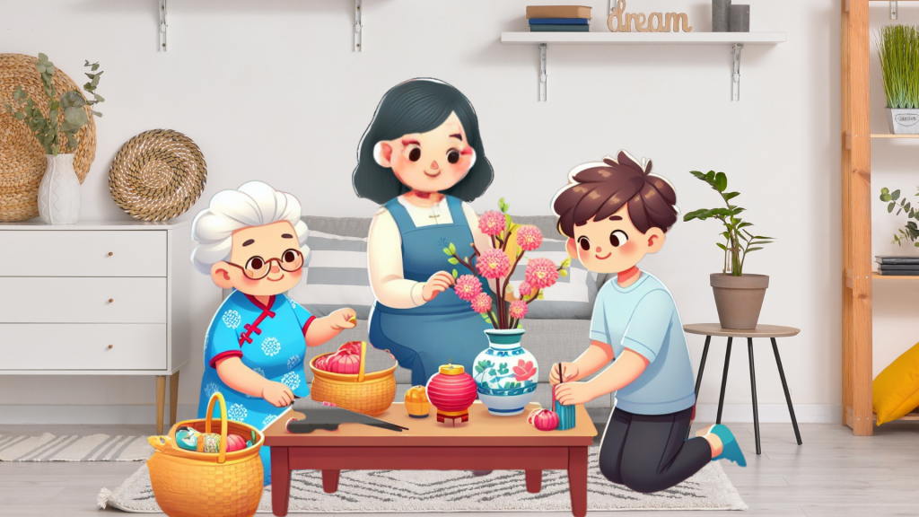 春節將至,外婆、媽媽和小圓坐在客廳裏,準備一起裝飾家居,增添家裏的節日氣氛。小圓好奇地問:「婆婆,為甚麼我們要過春節呢?」
