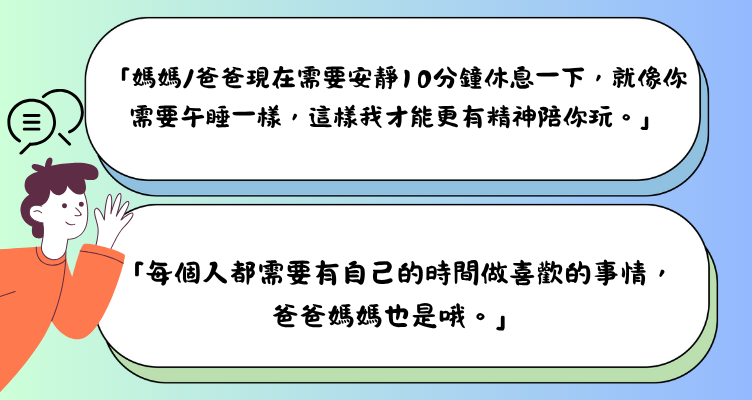如果感到疲累,不妨向伴侶、家人坦誠溝通自己的疲憊和需要支援的具體事情,例如:「今天能幫我輔導孩子的功課嗎」、「我今天很累,我們外出吃飯吧」。