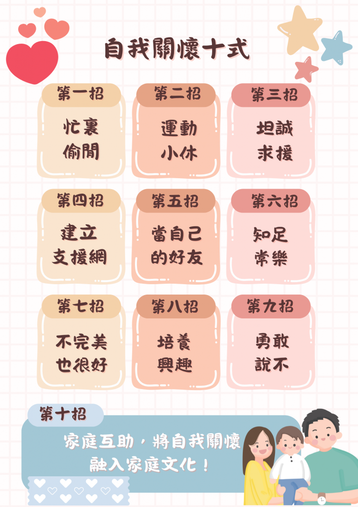 愛子女,就從愛自己開始。只有裝滿自己的杯子,才有源源不斷的愛流向家人。在需要時尋求支援,也是愛自己的表現。除了以上的小招式外,有需要時,也可以瀏覽其他機構所提供的情緒輔導服務和精神健康資訊。