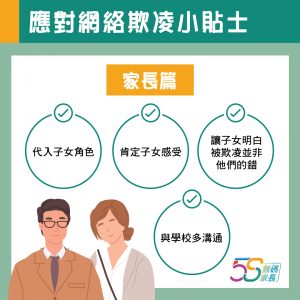 家長可跟孩子討論一些網絡欺凌的事例,讓孩子代入被欺凌者的感受,從而教導他們在傳送或轉發任何資訊前,須謹慎考慮資料有否罔顧他人感受。同時,家長亦應留意孩子在網上的表現及與人相處的態度是否合乎禮貌,教導他們應以尊重為原則交友。即使是旁觀者,轉載、分享及「讚好」網上資訊時宜先確定訊息真偽,並謹慎處理,以免誤墮網上欺凌的圈套,成為傷害受害者的一分子。