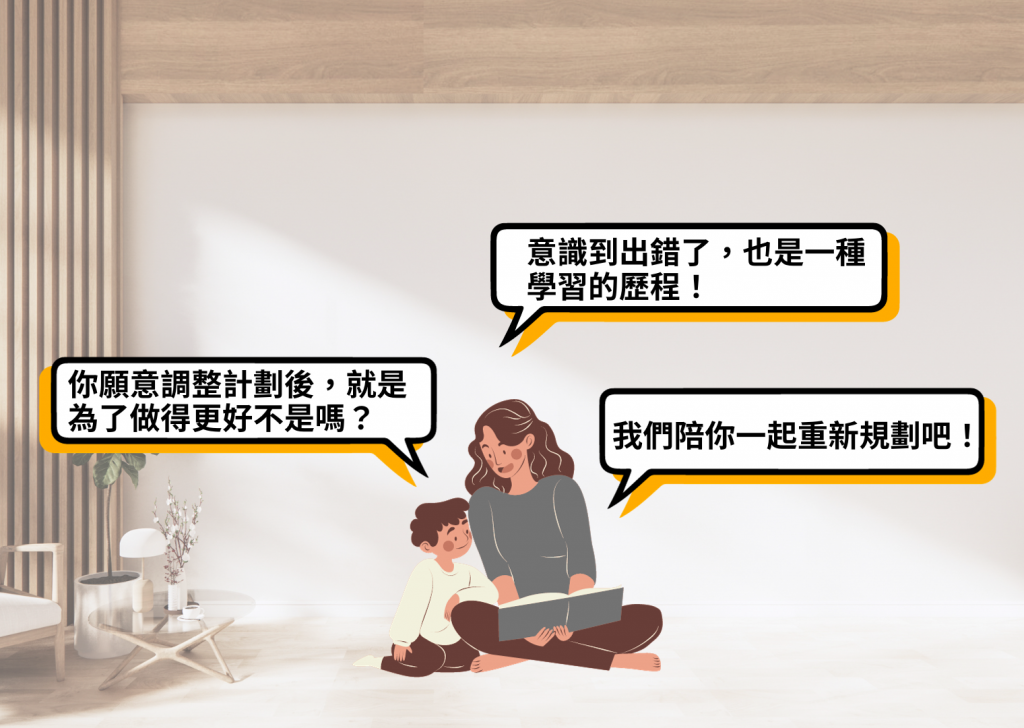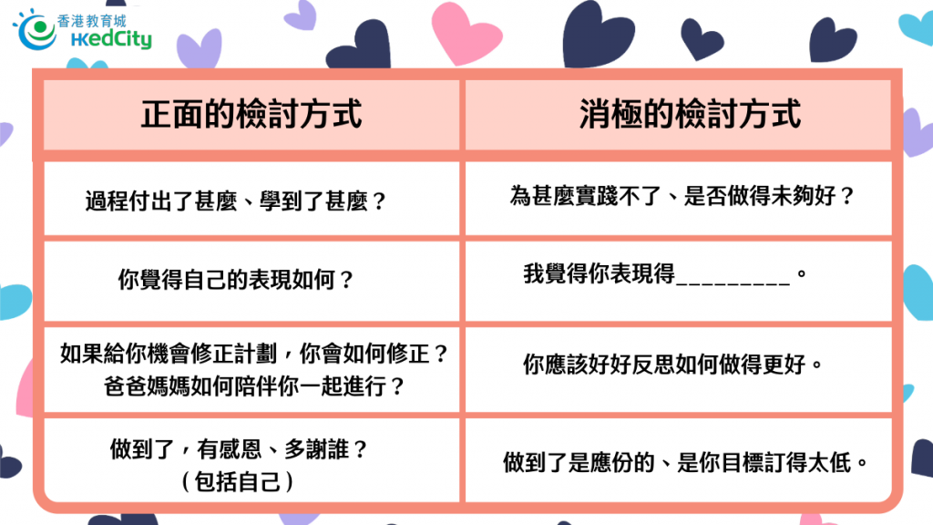 訂立目標時,不少子女會信心滿滿地許下承諾,但事實上成長路上太多有突發的情況,即使家長陪伴子女一起訂立目標,也難免有錯判的時候。這時家長需要的是立即行動和子女一起檢討調整,而非任由計劃失敗。檢討時宜告訴子女,適當的調整是生活中的常態,遇挫折了沒關係,只需立即調整也能重新出發。最重要的是,我們從中學到甚麼呢?正如我們一直強調的,檢討是為了肯定和鼓勵,而非批判和斥責。