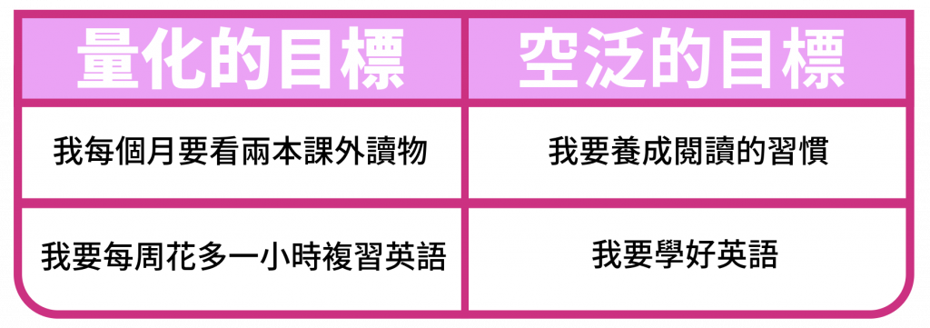 近年原子習慣的學說盛行,原子習慣的意思就是目標的訂立要由近處、由微細的地方開始,讓我們更有動力去執行。當然每一個細小的目標,或許都有一個遠大的發展方向,但家長和子女一起訂立目標時,還是建議先着眼於階段性目標,增加子女的成就感、減低前往目標路途上的疲憊感,以鼓勵他們繼續前進。