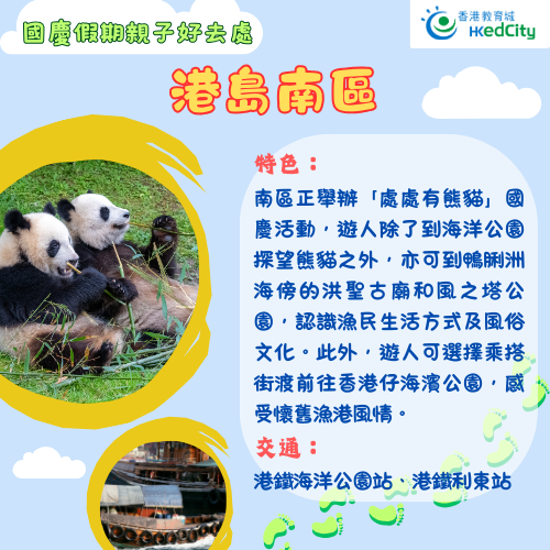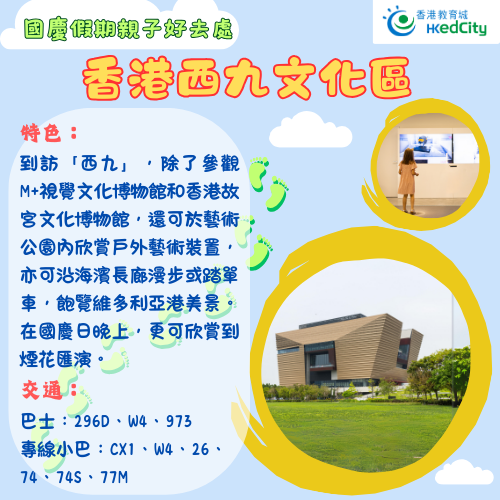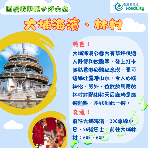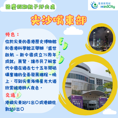 今年10月1日是中華人民共和國成立75周年的大日子,為了讓家長和子女共度一天美好的假期,教城特別推介以下活動,讓大家透過有益身心的活動共敍天倫。